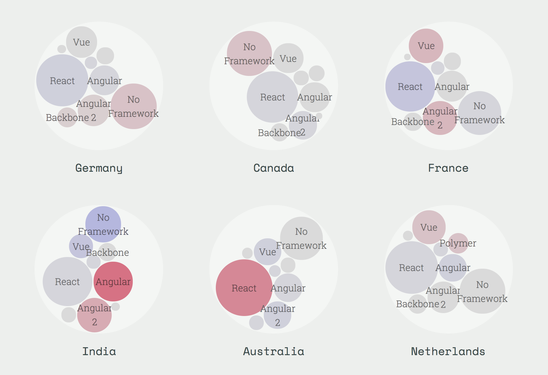 另一方面,印度似乎更喜欢 Angular。这可能至少在一定程度上是由印度充满活力的外包行业推动的,Angular往往的是那种大企业项目的完美选择。